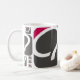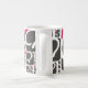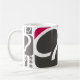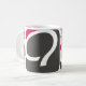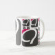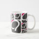 Uma caneca branca padrão com o logotipo da framboesa Q caracterizado em tamanhos e em formas diferentes.