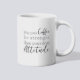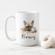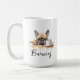 Uma caneca de café matinal com um buldogue francês com nome personalizado no estilo de script. "Que seu Café seja mais forte do que a atitude do seu cão" está escrito nas costas. Presente perfeito para donos de cães que têm um cachorro com atitude e também adoram café.