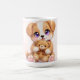 Comece o seu dia com um pouco mais de doçura com este cachorrinho fofo segurando uma caneca de ursinho de pelúcia. Apresentando um adorável cachorrinho abraçando um ursinho de pelúcia macio, este design caloroso captura a sensação aconchegante de conforto, amizade e inocência brincalhona.