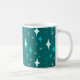 Uma caneca com um padrão de estrela retrô em verde água e branco sobre um fundo verde água escuro.