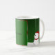 Boneco de neve pequeno adorável que olha sua imagem em uma caneca da foto.