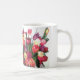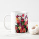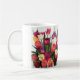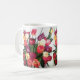 Uma caneca brilhante e bonita para seu café ou chá; enchido com as tulipas para adicionar a seu elogio da manhã. As tulipas vermelhas, cor-de-rosa, amarelas e roxas decoram esta caneca pelo artista Claire M Carlson.
