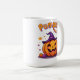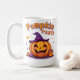 Celebre a estação assustadora com esta adorável caneca de Halloween do "Pumpkin Party"! Apresentando uma abóbora feliz e rindo vestindo um chapéu de bruxa roxa e mostrando um dente bonito e perdido, este design alegre é cheio de charme festivo. Para além da abóbora principal, há uma pequena abóbora comum, um pirulito roxo e um balde cheio de doces. À volta das abóboras flutuam pontos roxos e formas de starburst laranja, adicionando um toque mágico. Perfeito para beber café, chá ou chocolate quente neste Halloween! Faz um presente sazonal divertido para amigos, crianças, colegas de trabalho, ou qualquer um que ama vibrantes vibrações assustadoras. 🎃 💜