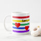 Listras coloridas e corações adornam esta "Caneca de Amor" Adicione sua escolha de nomes para torná-la especial. Ótimo presente para o dia dos namorados, aniversário ou qualquer dia especial para qualquer idade.