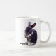 Uma caneca com o nome e o logotipo de BunnyLuv em um lado e no outro o majestoso e considerável, contudo modesto e acessível, jaspe, um dos coelhos de BunnyLuv disponíveis para a adopção agora.