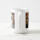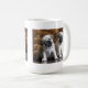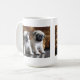 A caneca de dois Pugs é decorada por imagens de dois filhotes de cachorro do pug em uma superfície do vintage com fundo da pele.