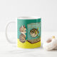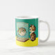 Uma caneca com um gato e um baiacu olhando um para o outro de surpresa