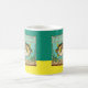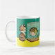 Uma caneca com um gato e um baiacu olhando um para o outro de surpresa