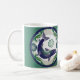 Com um sacudir da cauda, um salmão esvoaçante mergulha na segurança das camas de algas que fluem para se alimentar. Nessa ilustração estilizada, conchas, algas, plâncton e rede de peixes representam os elementos que estão sempre presentes durante o ciclo de vida do Salmão do Pacífico. A design apresenta lindas cores do oceano em azul, verde, verde e cinza. Uma série perfeita de presentes para amantes da natureza, pescadores ou qualquer um que ama um tema oceânico. Escolha das cores de fundo!