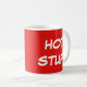 Caneca vermelha com as palavras "digno de nota" em um lado.
