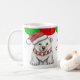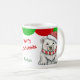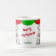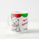 Nesta linda caneca de Natal para crianças, um urso polar veste um chapéu de Papai Noel vermelho e branco e um cachecol listrado. A imagem é impressa duas vezes na caneca, com o nome do seu filho em verde no centro, junto com uma saudação vermelha brilhante. O topo da caneca está bordado em vieiras verdes e vermelhas. Divertido para crianças de todas as idades!