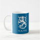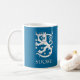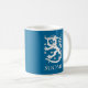 Caneca azul escuro bonita com texto de Finlandia/SUOMI no branco e no leão finlandês. O design dobro assim que a imagem podem ser considerados de ambos os lados do copo. Este é um ícone histórico Finlandia de simbolização e foi usado em moedas, em selos, em bandeiras, e em outros artigos do interesse nacional.