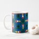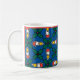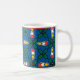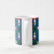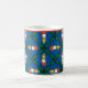 Uma caneca de café branca festiva, com um padrão sobre Holly e Velas sobre fundo azul claro.