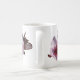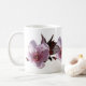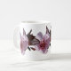 Flores Cor de Rosa. Aproxima-se da flor rosa de ameixa com folhas de marrom e estames cor-de-rosa-escuro, envolvendo a caneca.