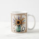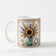 Esta encantadora caneca apresenta um fundo bege rústico com um jarro de pedreiro cheio de girassóis amarelos brilhantes e uma ferradura clássica ocidental. Perfeita para o seu café da manhã ou como um presente atencioso para qualquer amigo que ame o campo!
