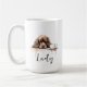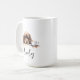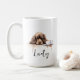 Uma caneca de café matinal com um paniel marrom, com nome personalizado no estilo do roteiro. "Que seu Café seja mais forte do que a atitude do seu cão" está escrito nas costas. Presente perfeito para donos de cães que têm um cachorro com atitude e também adoram café.