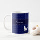 Padrão azul giro com uma faixa para o seu nome. Não se esqueça de trocá-la pela frente e atrás. Um gato curioso está esperando para ver qual é o seu nome.