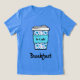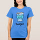 Tee em uma xícara de café estilizada para ir adornada com um padrão floral azul. Uma manga azul clara chamada "le Café" envolve a taça. Abaixo dele, a palavra "Café da manhã" é escrita em uma fonte preta, divertida e escrita à mão, evocando uma vibração matinal de café.