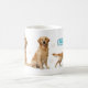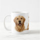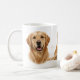 Este design de caneca de 11oz com Golden Retriever em alta resolução apresenta um retrato de cachorro realisticamente belo misturado com uma pose de corpo inteiro para um layout contínuo da esquerda para a direita. Iluminação natural suave, fundo branco limpo, sombras suaves e sotaques sutis de pegadas criam uma aparência refinada e elegante.