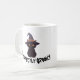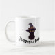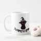 caneca com gato preto vestindo um chapéu de bruxa e um texto com um "puramente assustador"