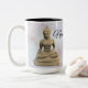 Um Buda de ouro, pensivo, em um pano de fundo de quartzo de rosa claro com a legenda, "Namaste brew" Pode surgir pensamentos pacíficos quando bebendo desta caneca.