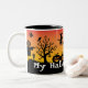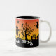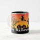 fundo de halloween com espantalho, abóboras assustadoras e uma bruxa