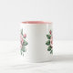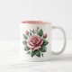 Este item é uma caneca de café com um sotaque cor-de-rosa dentro da caneca. Do lado de fora da caneca estão rosas rosa em ambos os lados.