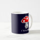 Uma caneca com um design de cogumelo vermelho em cada lado e um fundo escuro. O texto diz "Eu sou um fungo", mas pode ser mudado.