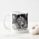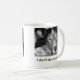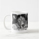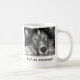 Close up de uma cara do sheltie do sono em uma caneca de café com "eu não faço manhãs"