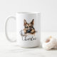 Uma caneca de café matinal com um german shepherd com nome personalizado no estilo de script. "Que seu Café seja mais forte do que a atitude do seu cão" está escrito nas costas. Presente perfeito para donos de cães que têm um cachorro com atitude e também adoram café.