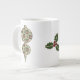 Quatro quadrados em verde e bronzeado são enfeitados com ornamentos vermelhos decorados com flocos de neve brancos e holly verde com bagas vermelhas. A costura branca acrescenta um toque decorativo, dando ao padrão repetitivo a aparência de uma colcha, criando um sentimento perfeitamente aconchegante para o feriado de Natal. A forma de um ornamento de lágrima cria uma máscara para o design adicionar um toque sazonal final. Esta caneca está disponível em jumbo, espresso e tamanhos e estilos de porcelana óssea.