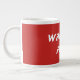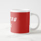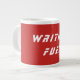 escrevendo com esta caneca energética de "combustível escrevendo" em letras retrógradas e fundo vermelho brilhante.
