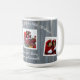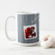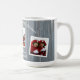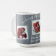 Esta adorável caneca de Natal tem um fundo de conselho de celeiro rústico e quadros fotográficos para três das suas fotos favoritas da família. Acima das fotos lê-se "Tenha um Natal Feliz e abaixo das fotos está um espaço para você personalizá-lo com seus nomes. Esta caneca faria um presente tão bonito para avós, tias e tios!