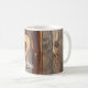 Uma foto de um quadro em forma de coração pendurado numa cerca de madeira rústica mostra as texturas únicas de madeira e clima. A mensagem é " Mas primeiro café" ou adicione sua própria mensagem para uma caneca de café exclusiva e personalizada.
