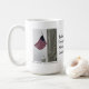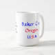 A fotografia azul das bênçãos da montanha traz um momento patriótico a esta caneca do presente da lembrança. A arquitetura impressionante caracteriza as águias cinzeladas que guardam o vôo da bandeira americana nas torres históricas do padeiro na cidade do padeiro de Oregon oriental. Americana rústica.