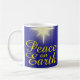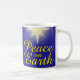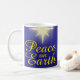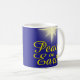Ponha um chocolate quente delicado desta "Peace on Earth Star Christmas Mug". Apresenta um fundo azul escuro com uma estrela brilhante com a frase festiva "Paz na Terra" em amarelo. Que esta taça de Natal ajude a espalhar um pouco de alegria de Natal.