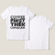 Comece seu dia com este design de camiseta ousado, mas simples que fala com cada amante do café! Apresentando uma tipografia sans-serif limpa e uma paleta monocromática elegante, a camiseta "Café Primeiro, Depois Conquistar" é perfeita para aqueles que acreditam em começar seu dia com cafeína e confiança. Excelente para: Entusiastas de café e viciados em cafeína. Office, casual ou visto de trabalho de casa. Dar presentes para aniversários, feriados ou momentos "só porque".