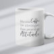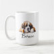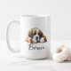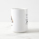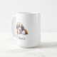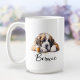 Uma caneca de café matinal com um santo bernard com nome personalizado no estilo de script. "Que seu Café seja mais forte do que a atitude do seu cão" está escrito nas costas. Presente perfeito para donos de cães que têm um cachorro com atitude e também adoram café.