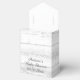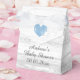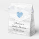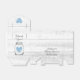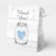 Caixa de chá de fraldas do garoto de grão branco. Tenda elegante favorece caixas para celebração do novo menino. Design russo com textura de fundo de madeira, corações de safra azul e contorno de jarro de pedras. Perfeito por agradecer a vinda dos convidados. Parte de convites e adesivos correspondentes.