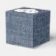 Coração branco com nomes de recém-casados em fundo de denim jeans azul.