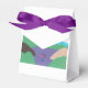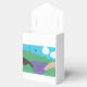 Esta caixa de presentes foi projetada com um design de arte em papel de montanhas verdes e um lago azul com balões de ar quente acima.