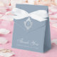 Uma caixa de favor de casamento em tom azul poeirento. Na aba, tem uma crista em foil prateado falso com um monograma dentro, a partir de 2 iniciais.