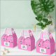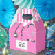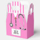 Favor de festa de enfermeira criativa com uniforme hospitalar rosa. Edite o texto para personalizar.
