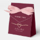 Caixa de favores de noiva simples, elegante, mínima e moderna, vermelha e burgundy, com noiva e nomes de noivos, data e coração de corda dourada.