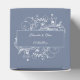 Personalize uma caixa de favoritos de casamento única para convidados com esta Caixa de Favoritos de Casamento Azul Dusty. O design de caixa de favoritos apresenta uma folha elegante floresce com fundo colorido correspondente. Personalize com os nomes do noivo e da noiva junto com a data do casamento. Material adicional disponível com esta design também.