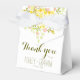 Linda caixa de favoritos de casamento em um esquema de cores amarelo e verde alegre em um fundo branco nítido. Ilustração original de florais e verde adornam a parte superior, frente e trás da caixa. Personalize com seu texto, os nomes da noiva e noiva e a data do casamento. Perfeito para um casamento ao ar livre, primavera, verão, noite ou jardim.