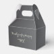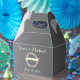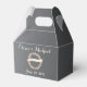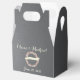 Num fundo de quadro, a frente da caixa é enfeitada com uma adorável coroa floral em marfim, rosa, e pêssego e uma faixa que diz, "Feliz para sempre". Os nomes da noiva e noiva e a data do casamento são personalizados em uma fonte cursiva caprichosa para uma caixa de favor divertida e casualmente elegante. Adicione sua própria mensagem pessoal no verso.