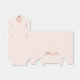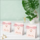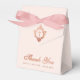 Uma caixa de favor rosa para o batizado de uma menina. Na aba, tem um brasão em dourado rosa com uma cruz no meio. A mensagem Agradecido é escrita na parte inferior, em uma fonte elegante em dourado rosa, a ocasião e a data são escritas em maiúsculas abaixo. O fundo é rosa suave.
