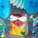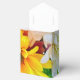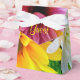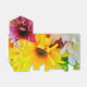 Fotografia mista disies Buquê-flor de um belo buquê de margarida. Assias amarelas, rosadas e brancas brilhantes misturadas com flores verdes do crisântemo. Coloquei uma área de texto na aba frontal para você editar. O texto é amarelo cursivo e diz: convidado. Edite o texto para dizer o que quiser. Exclua-o se não for desejado. Estão disponíveis placas de papel de coordenação e guardanapos.