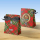 Crachá da crista Clan Scott rodeado por uma correia e fivela sobre fundo vermelho-tartano. Texto personalizado e monograma.